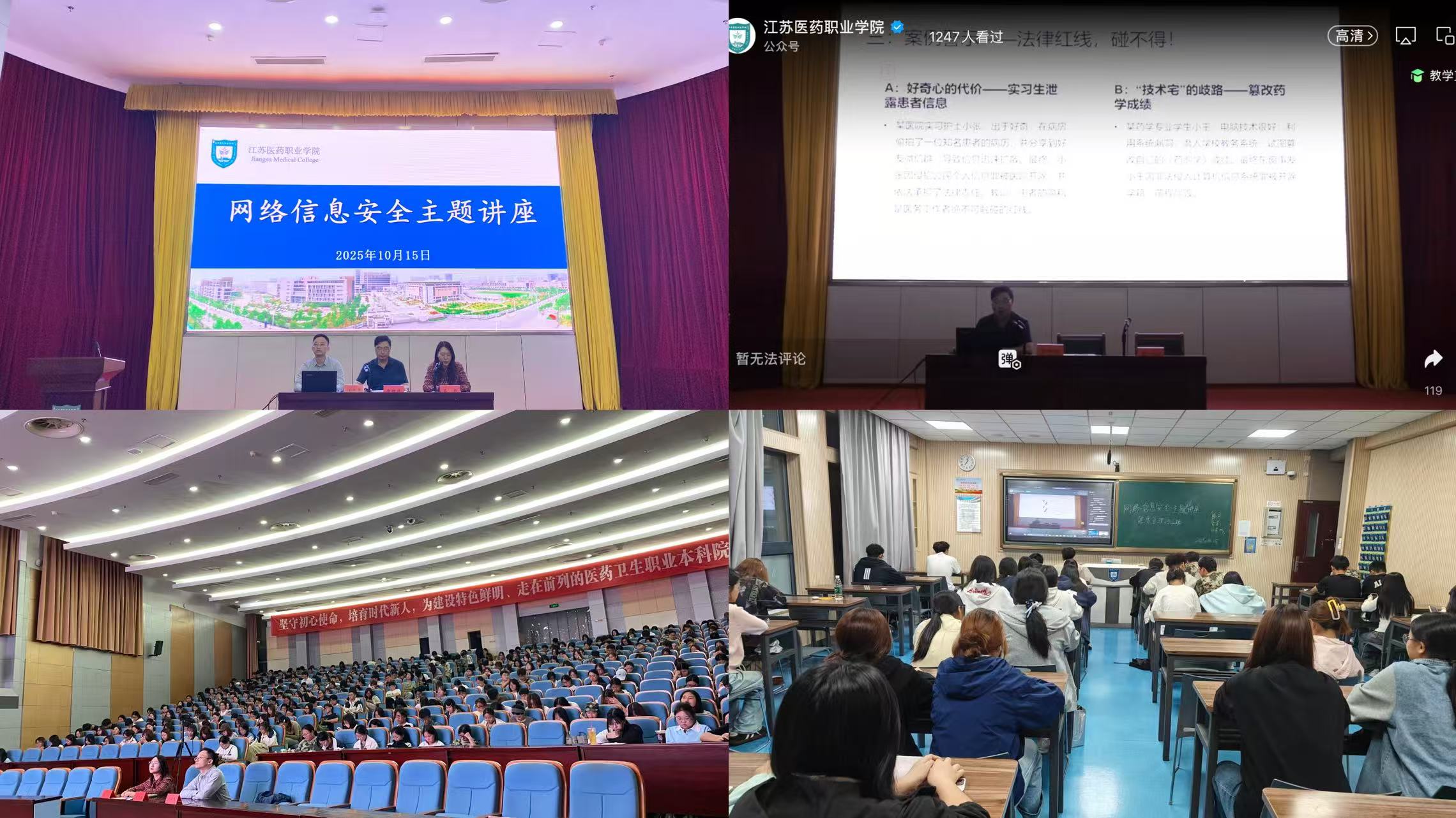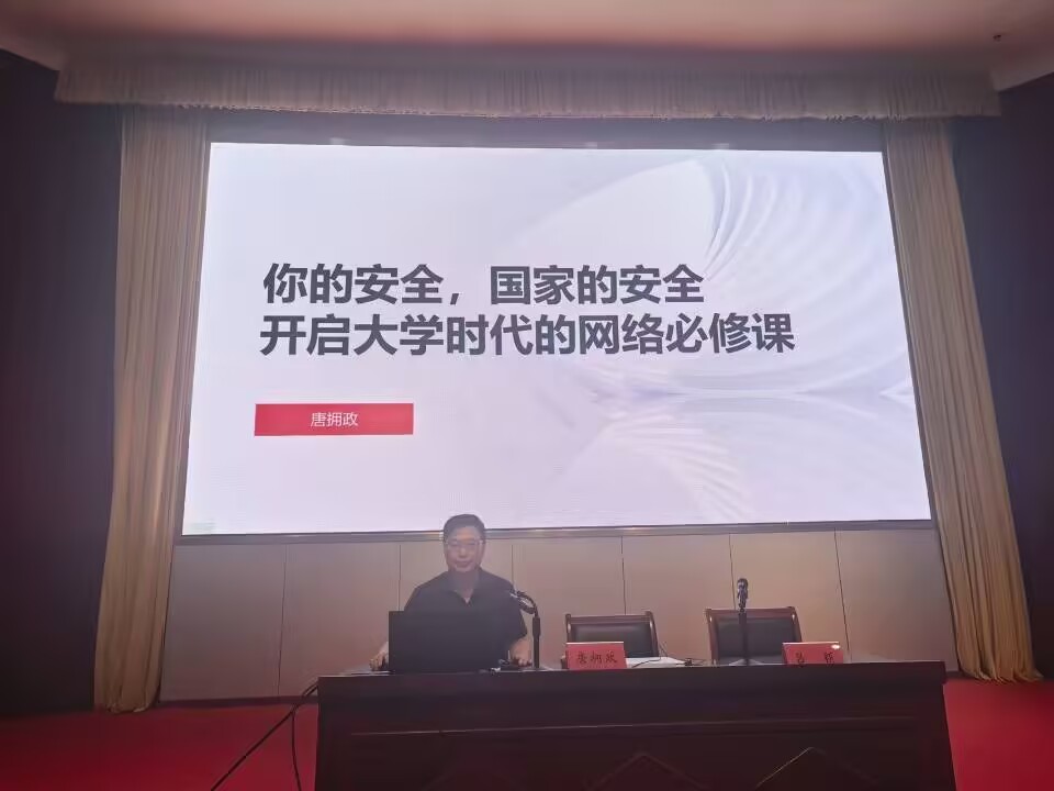 为有效提高2025级新生的网络安全意识与网络文明素养,10月15日,我校在国际会议中心举办了网络信息安全主题讲座。此次讲座特别邀请盐城工学院信息化办公室唐拥政教授担任主讲人,采用“线下主会场+智慧教室直播”的方式进行,讲座由教务处副处长吕颖主持。